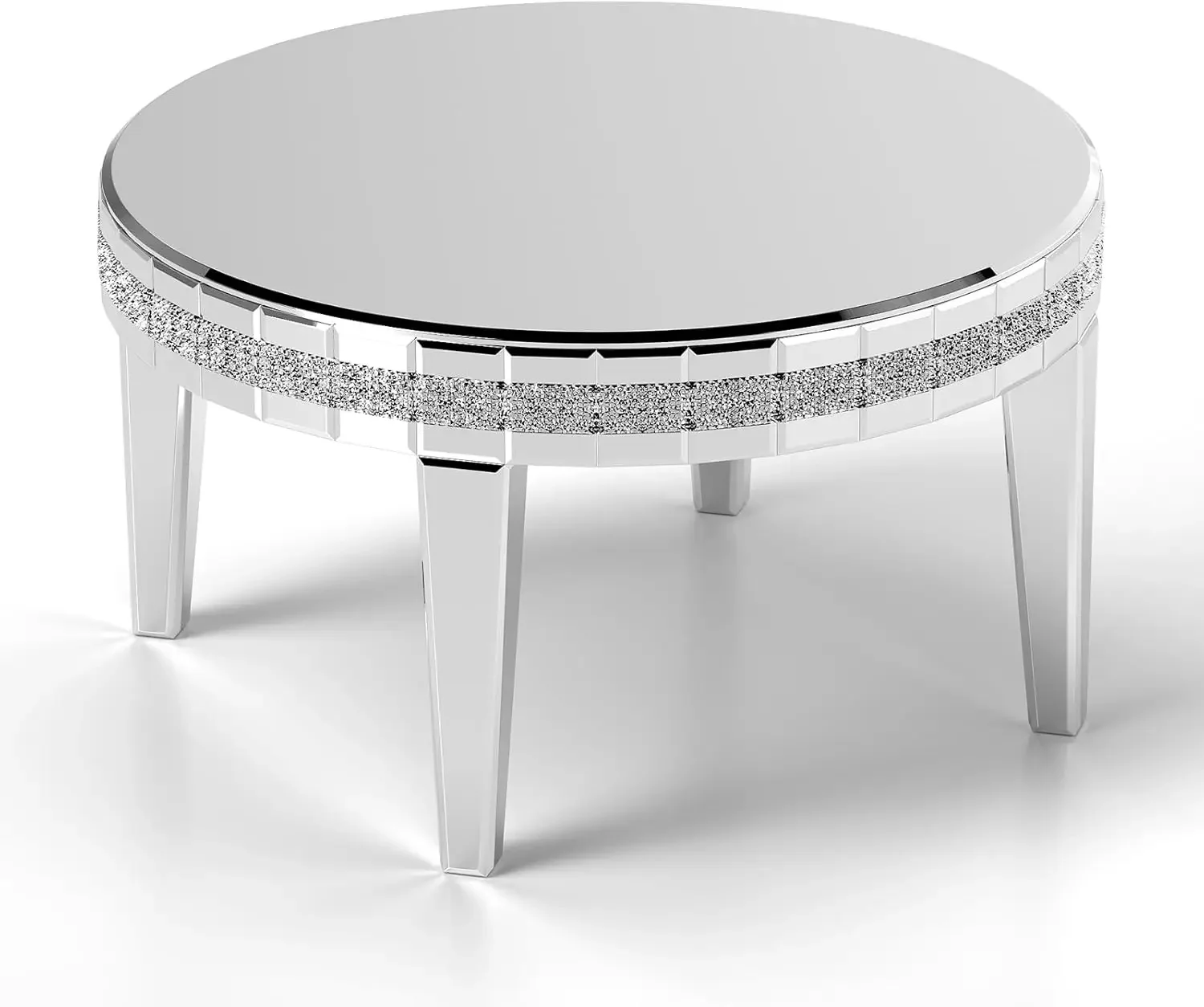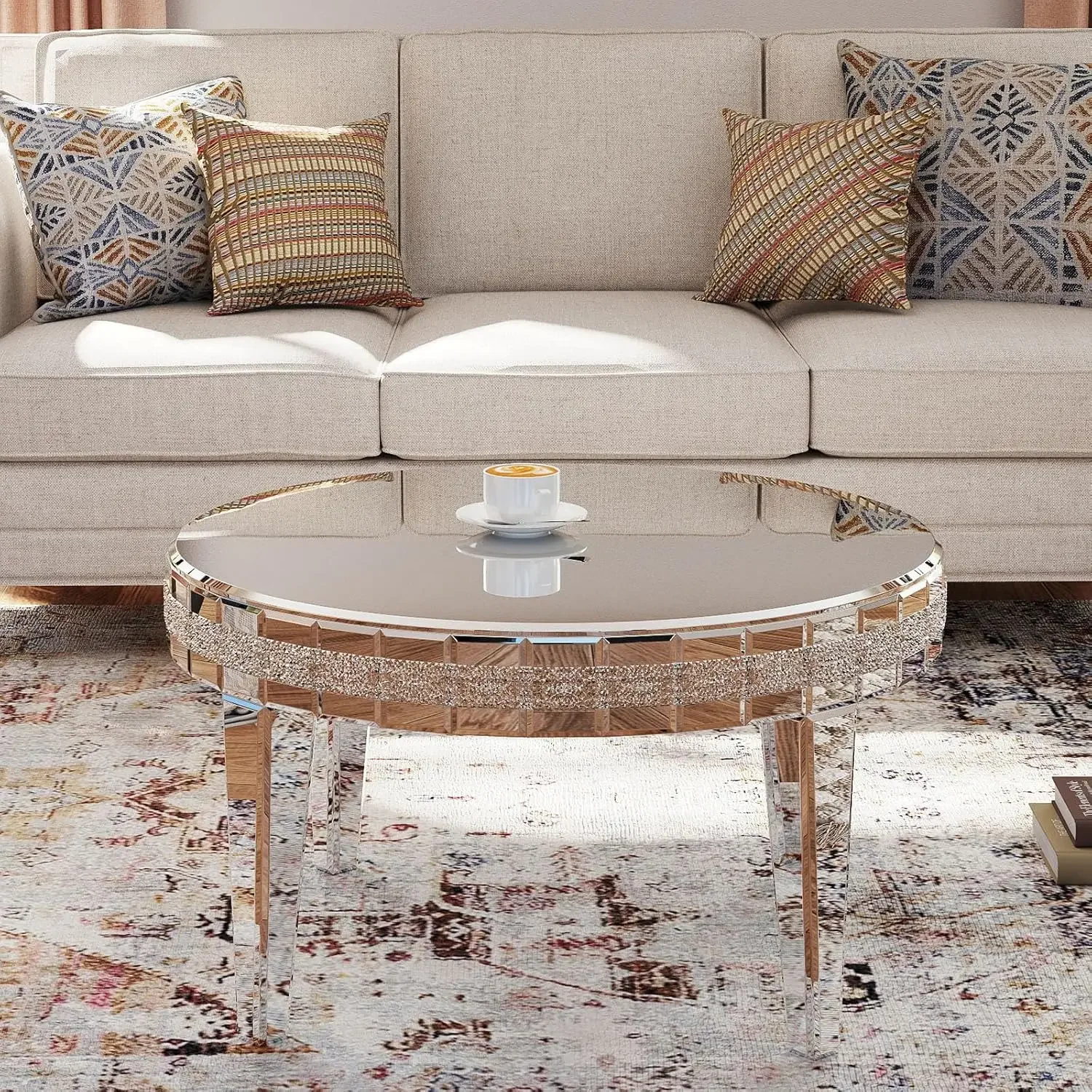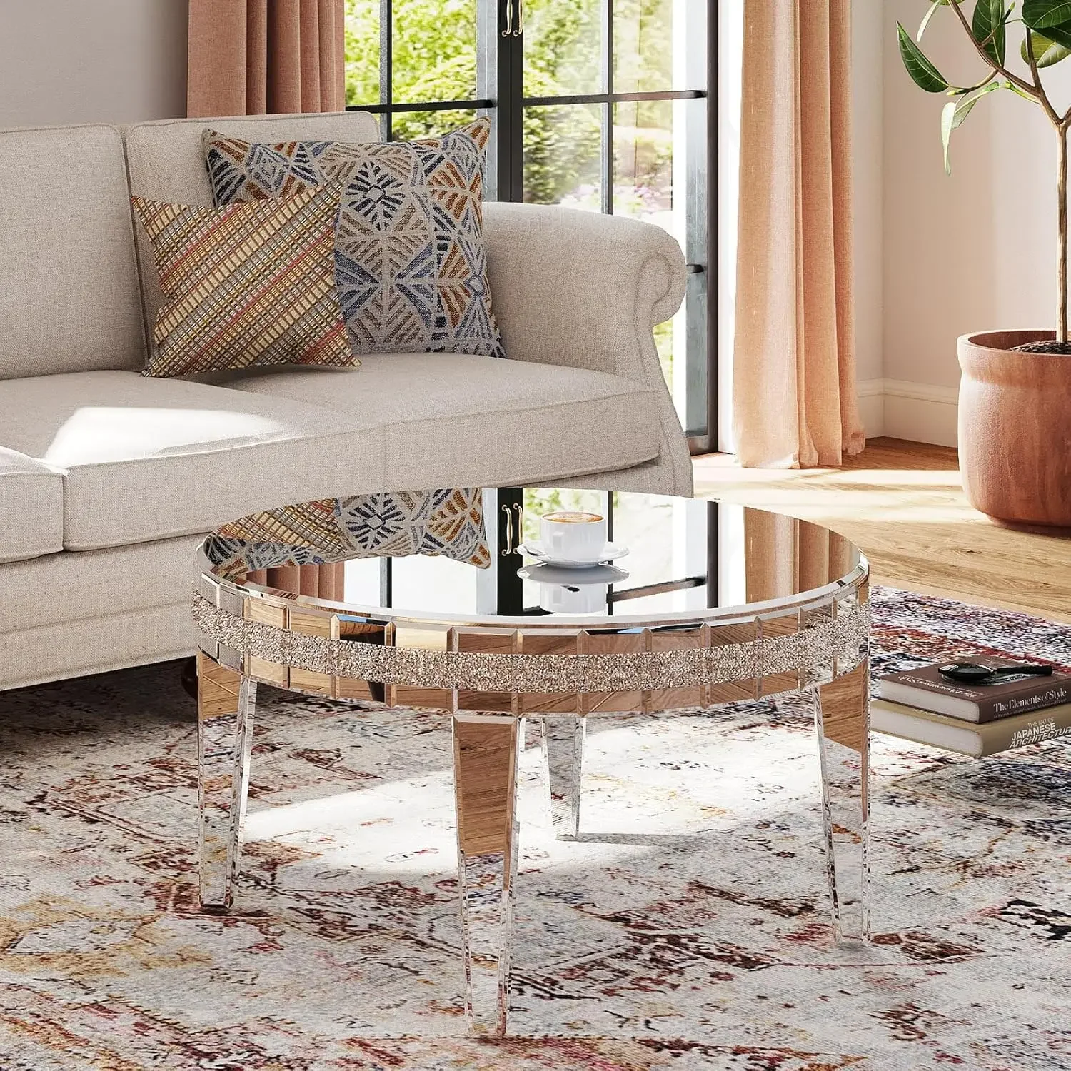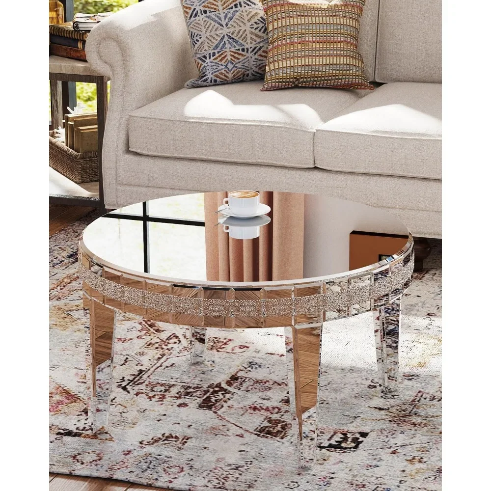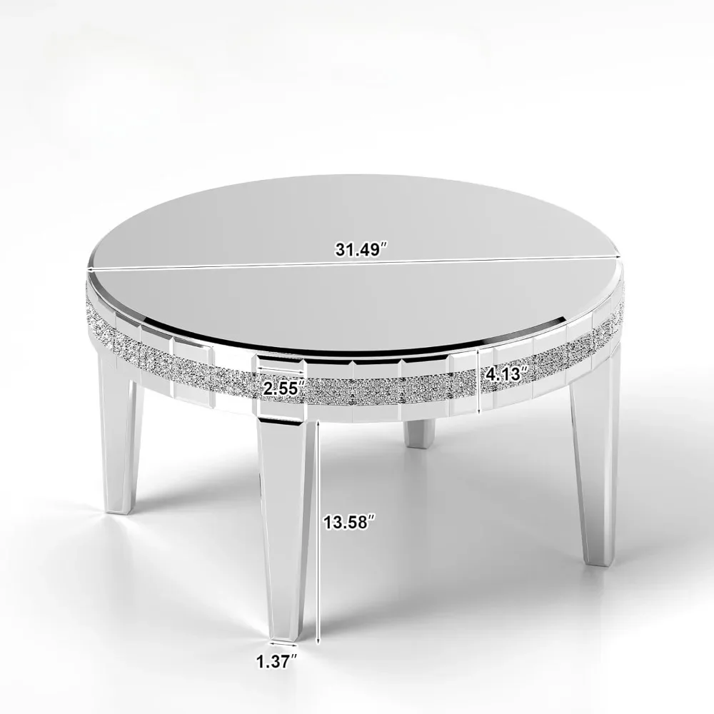 Silver Living Room Circular Coffee Table, Uxurious Mirror Finish,31.5inch Mirror Finish Coffee Table with Legs and Crystal Inlay
