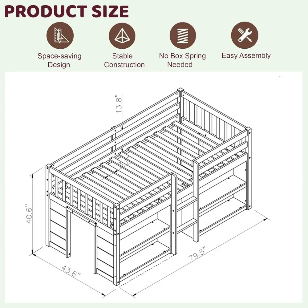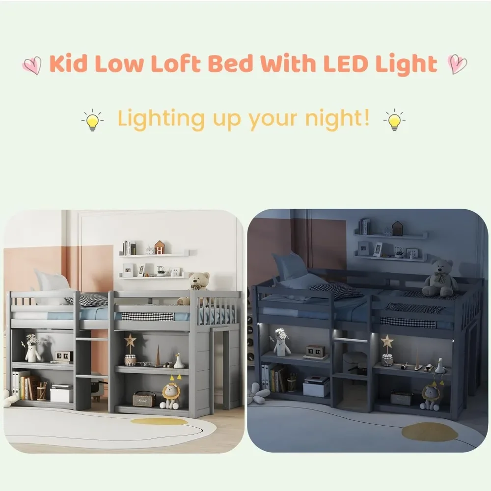 Twin Size Low Loft Bed with Storage Shelves, Wood Kids Twin Loft Bed with LED Light and Shelves,Low Loft Bed for Kids,Boys Girls